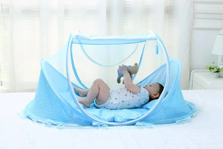 Um berço portátil com o véu de proteção para a mamãe não precisar mais se preocupar com mosquitos.